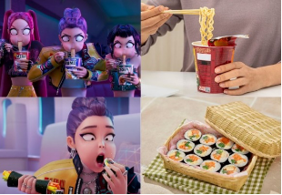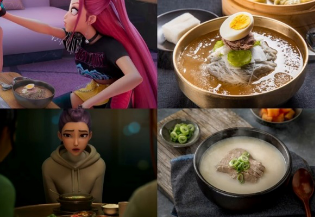 ᄋ 한국인의 소울 푸드, 컵라면과 김밥: 루미, 미라, 조이는 오뚜기 진라면을 연상케 하는 컵라면과 김밥을 함께 나눠 먹는다. 특히 컵라면이 익기까지 애타는 3분을 기다리는 장면은 한국인들의 마음을 잘 담아냈다.